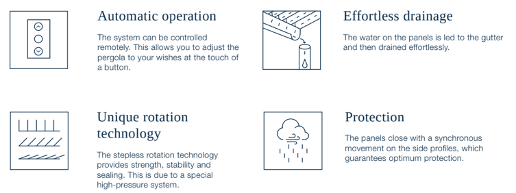 The Royal pergola has a durable and sleek design which makes this roof a real addition to your home. With a remote control, the panels are easy to rotate into a position that creates the perfect light for you. Because the panels are continuously adjustable up to 120 degrees, you can even let the panels rotate with the sun!