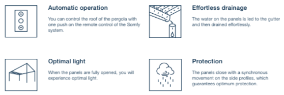 Would you like to have an open space above your terrace in no time? With the push of a button, you can open the roof panels of the Royal Crown and create a convertible effect in your garden. In the open position, the pergola offers maximum light. At the same time, in a closed position the Royal Crown protects against various weather conditions and offers you a shady spot on sunny days. Rain or shine, you will experience the ultimate outdoor living feeling.